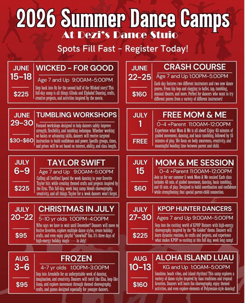 Our 2026 Summer Dance Camps are the perfect choice for families looking for fun and engaging summer activities for kids in Star Valley. With a wide variety of options for all ages and experience levels — our camps are designed to keep kids active, creative, and confident all summer long. From high-energy themed camps like Wicked, Taylor Swift, and KPOP Hunters to fun, young age-appropriate options like Frozen and our Aloha Island Luau, and many more, there is something every child will love. Whether you’re looking for full-day summer camps or shorter programs, our camps provide a safe, positive environment where kids can make friends, try new things, and build confidence through dance. Spots are limited and tend to fill quickly, so we encourage families to plan ahead and reserve their dancer’s place early. Save your spot today!